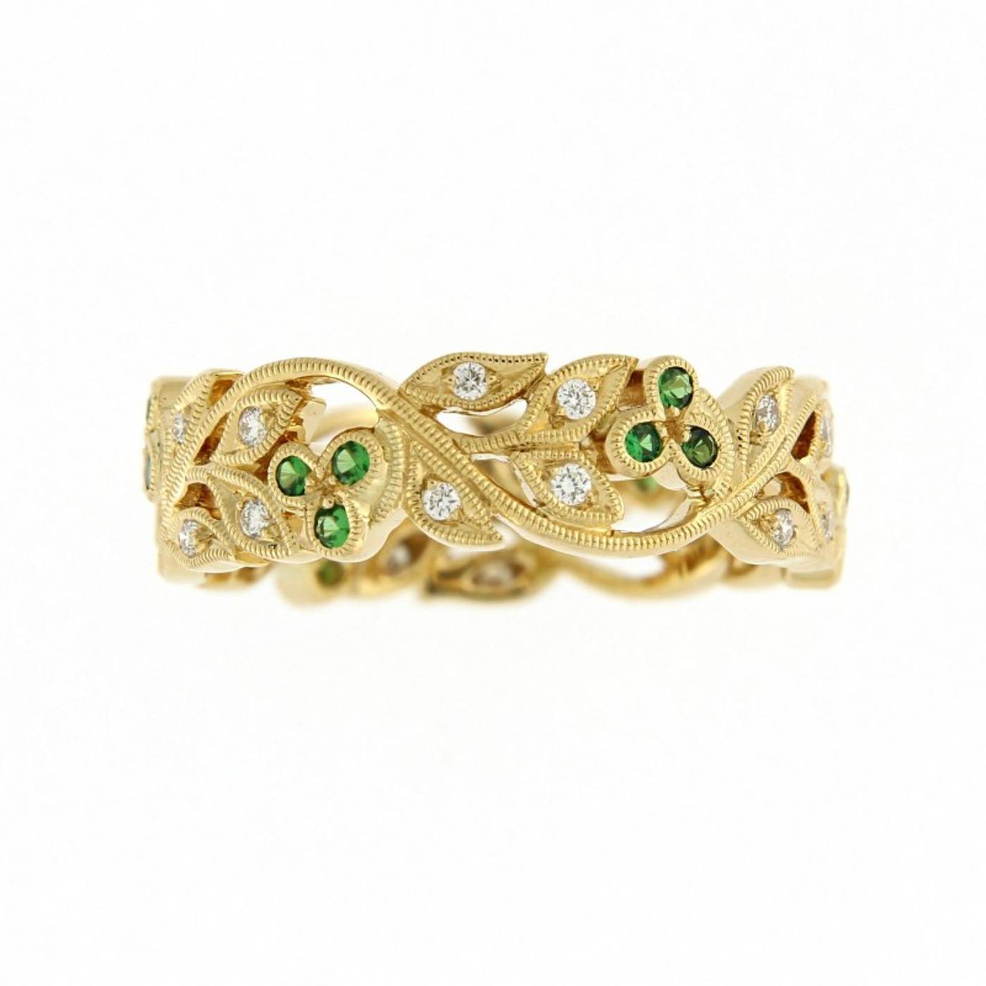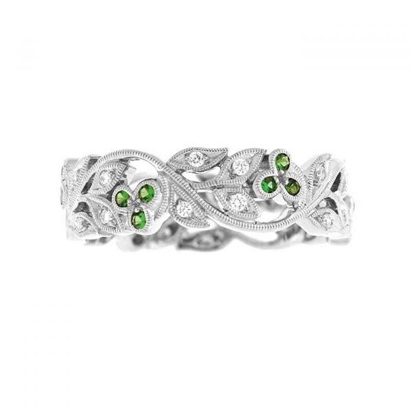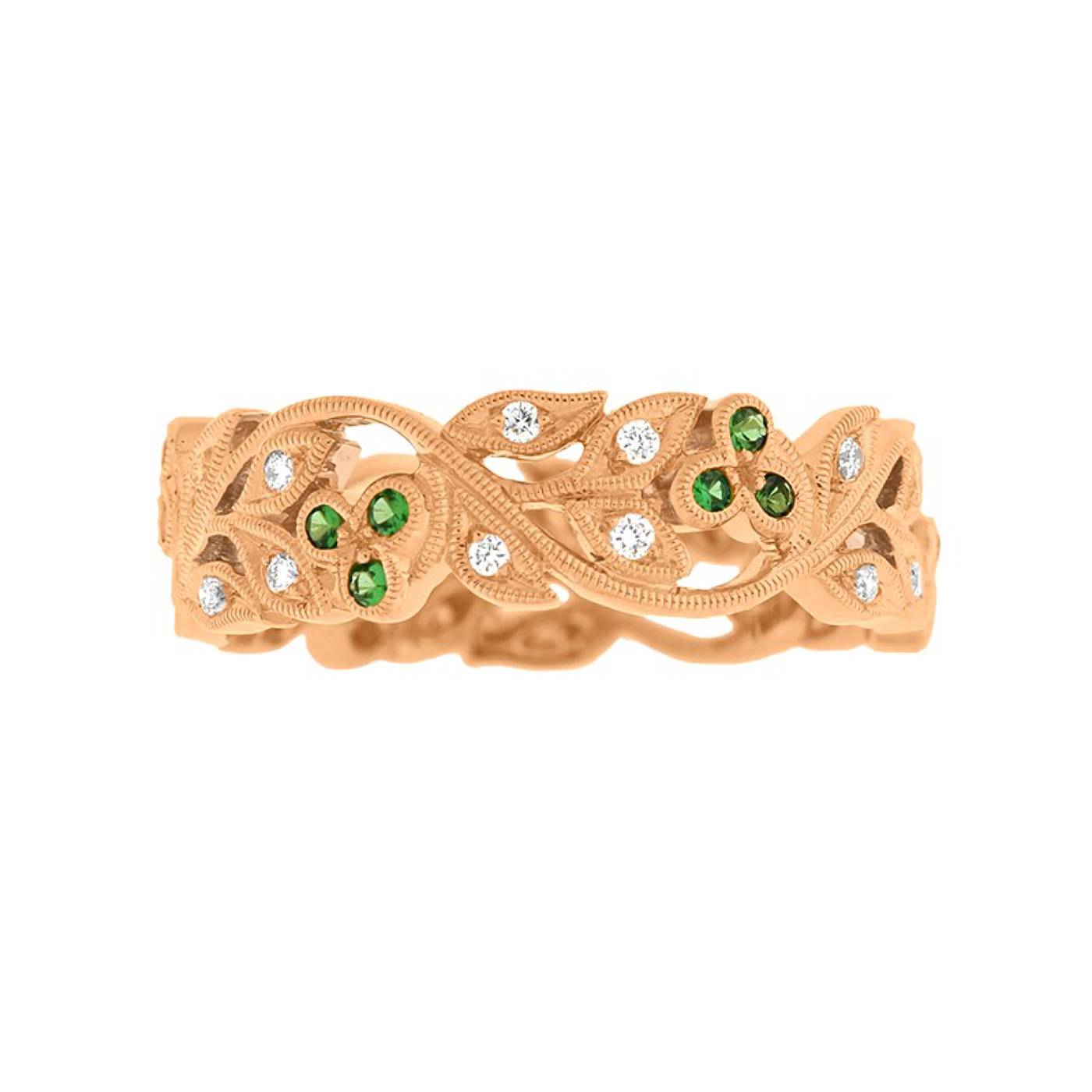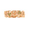 Élégante bague dentelle d’une largeur de 6 millimètres, sublimés par 24 diamants (0.20 carat) et de 18 émeraudes (0.12 carat)