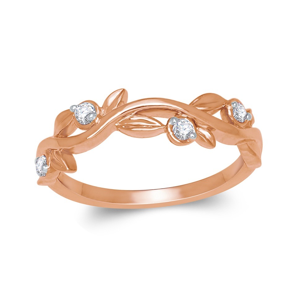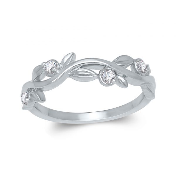 Bague alliance au motif feuillage ondulé, ornée de quatre diamants délicatement sertis tels de petits bourgeons en pleine éclosion.
