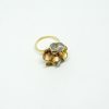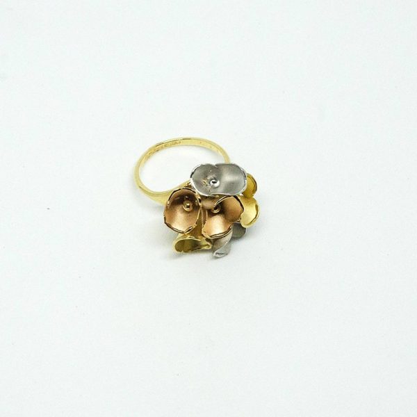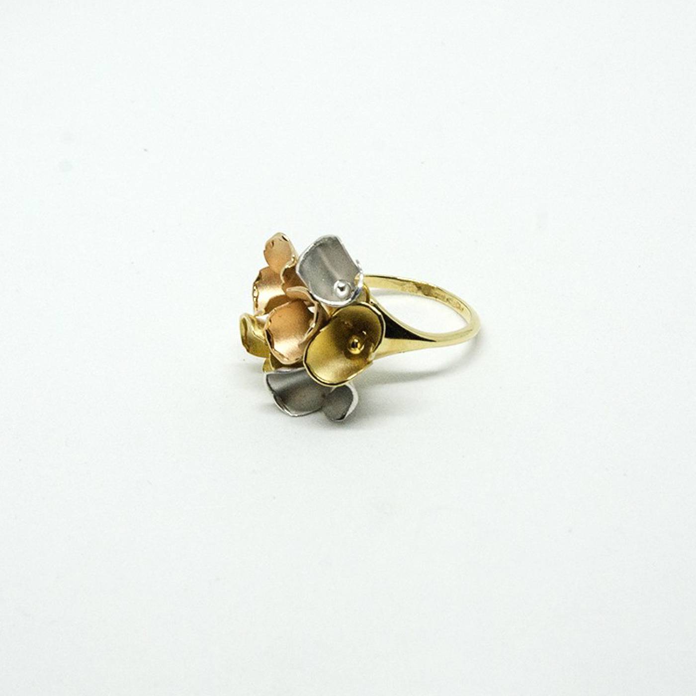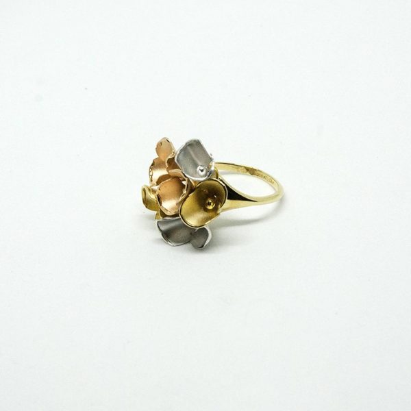 Bague « Arum » trois ors 750/1000, anneaux en or jaune, et ornement de fleurs trois ors (jaune, blanc et rose) sablées et finies par ourlés polis.
