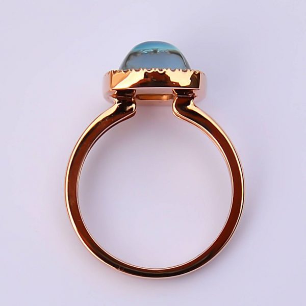 Belle Topaze bleue (3.62 carat) cabochon taille coussin sur fond de nacre.