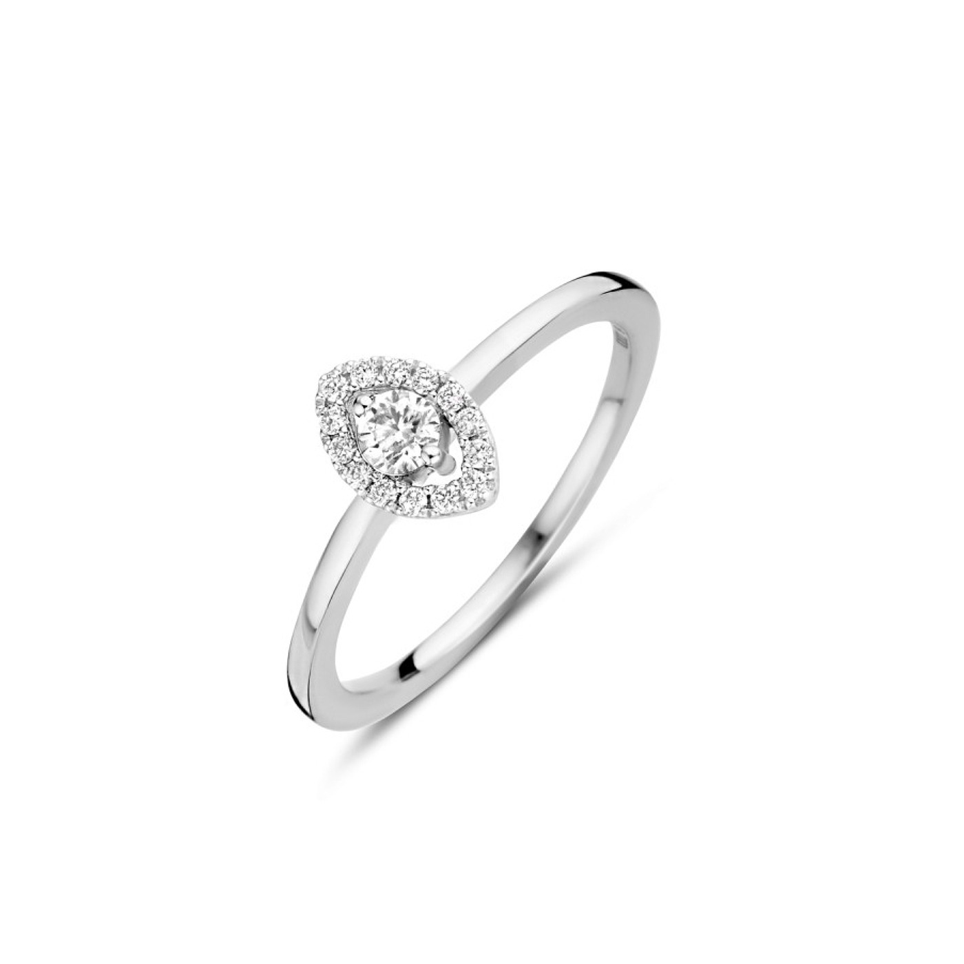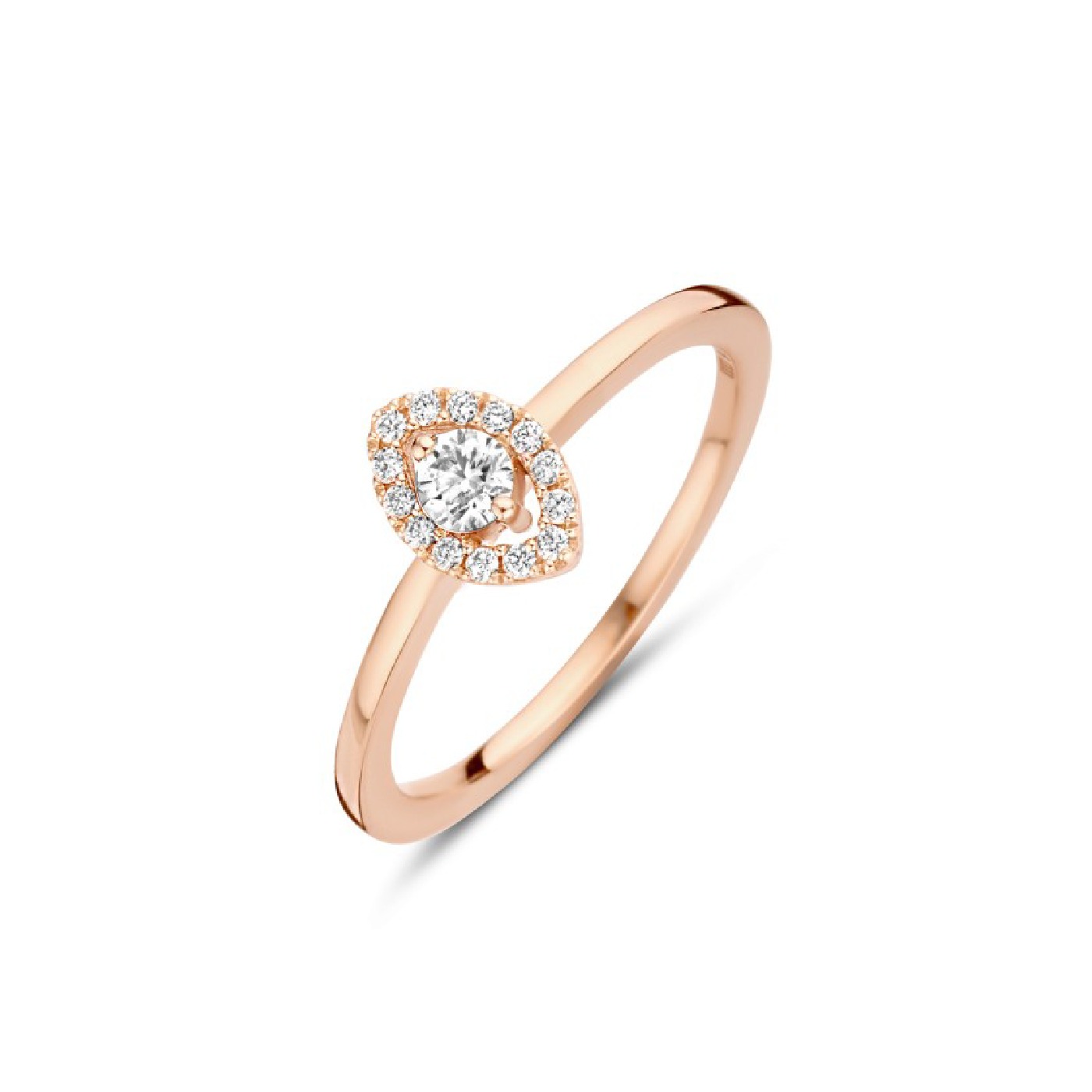 Déliquat solitaire fin avec le style et son centre Diamant et son entourage de forme navette .