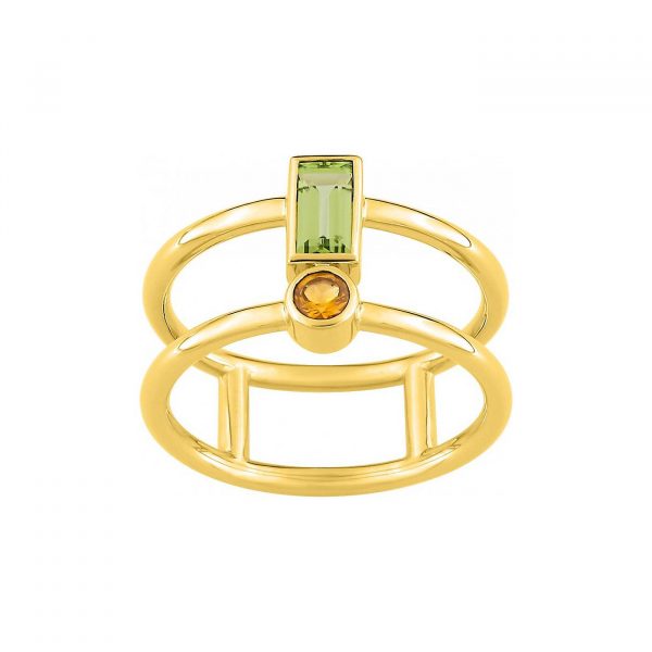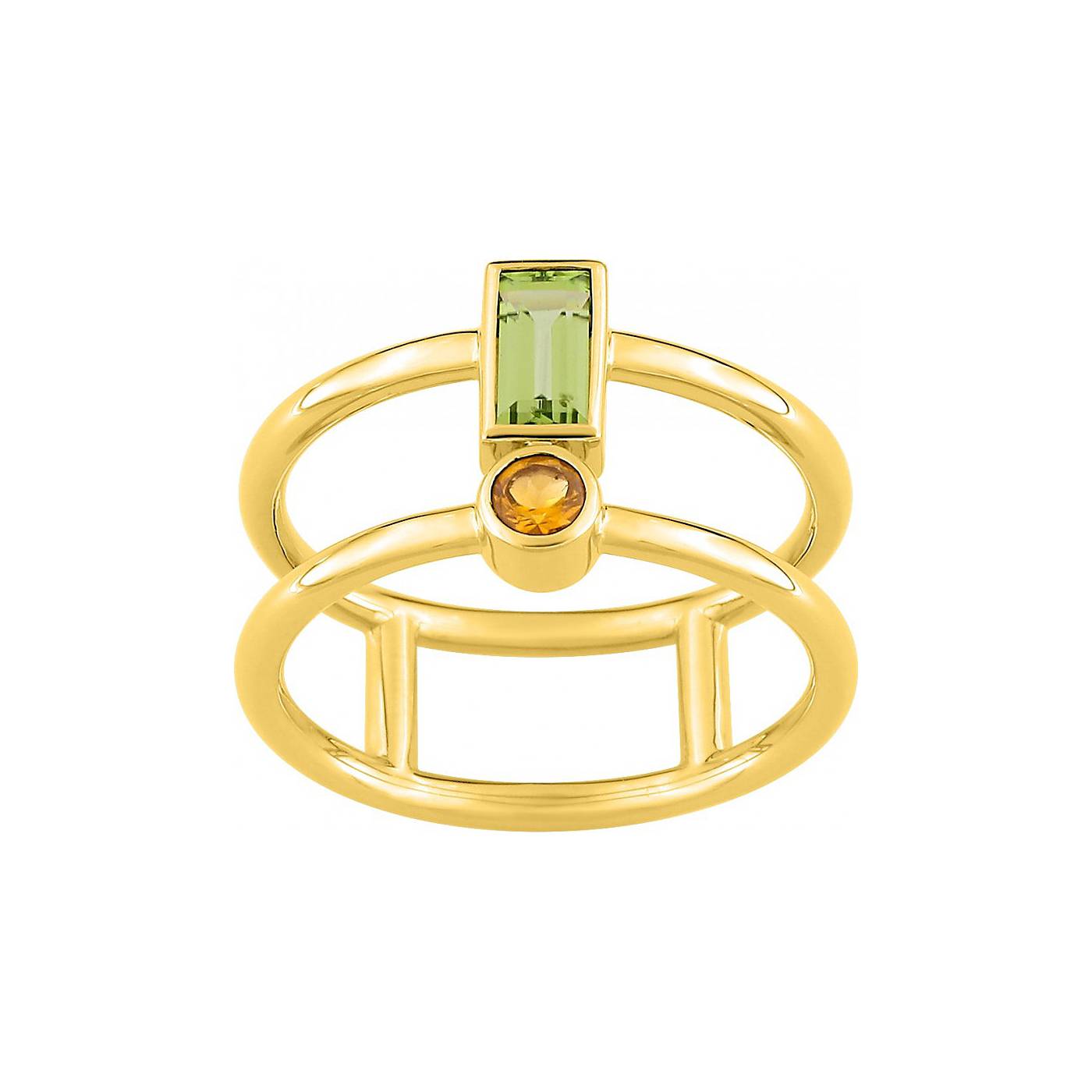 Double anneau en fil rond relié entre eux et surmonté de 2 pierres fines.