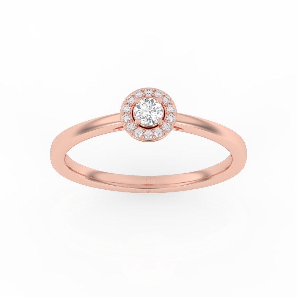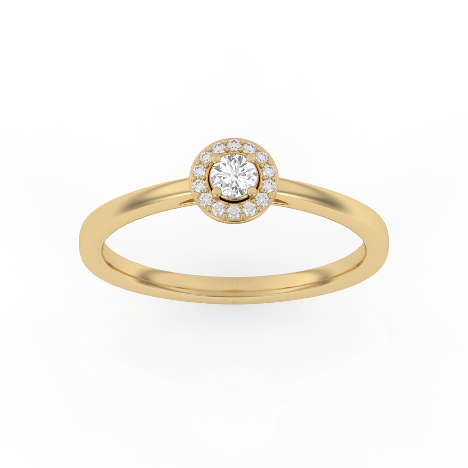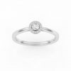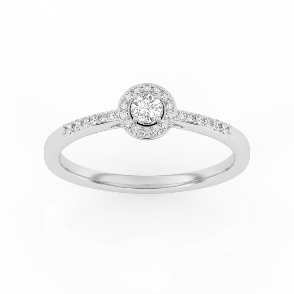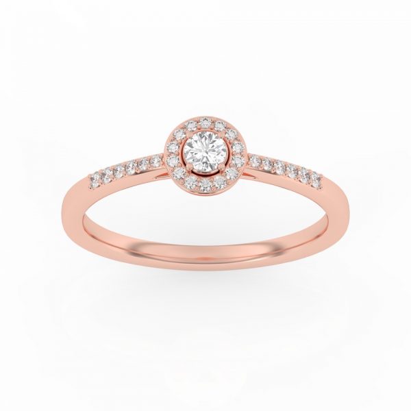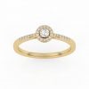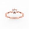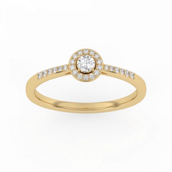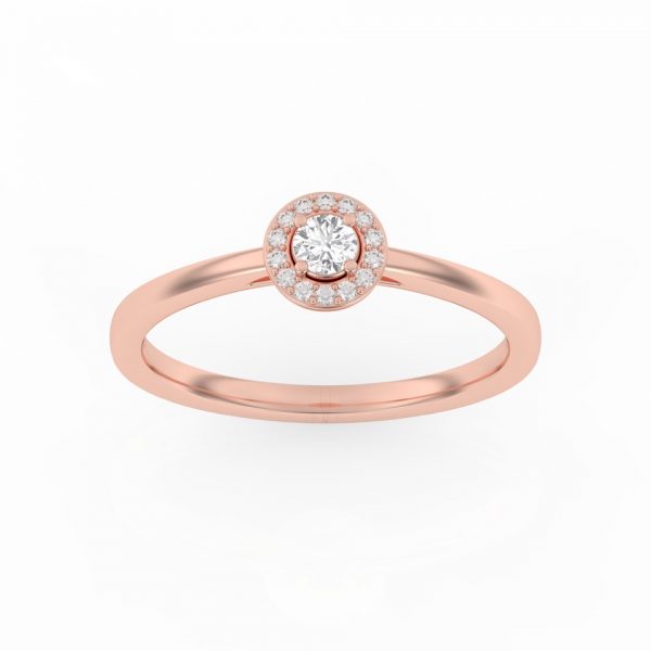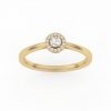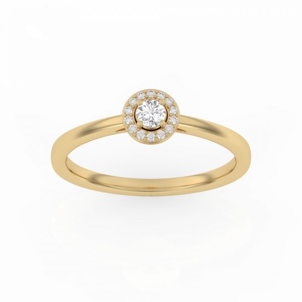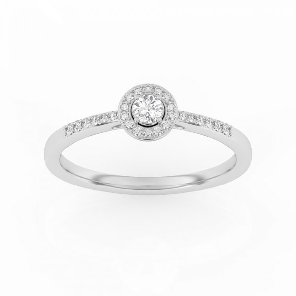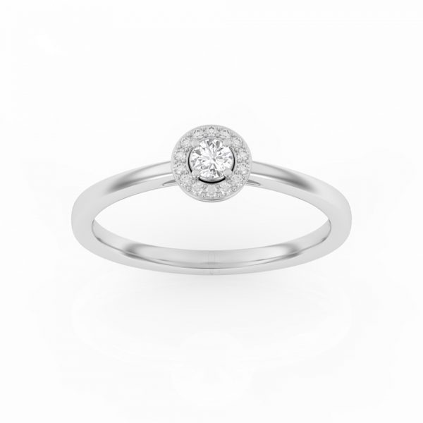 Bague solitaire avec son diamant central entouré d’un halo fin et délicat.