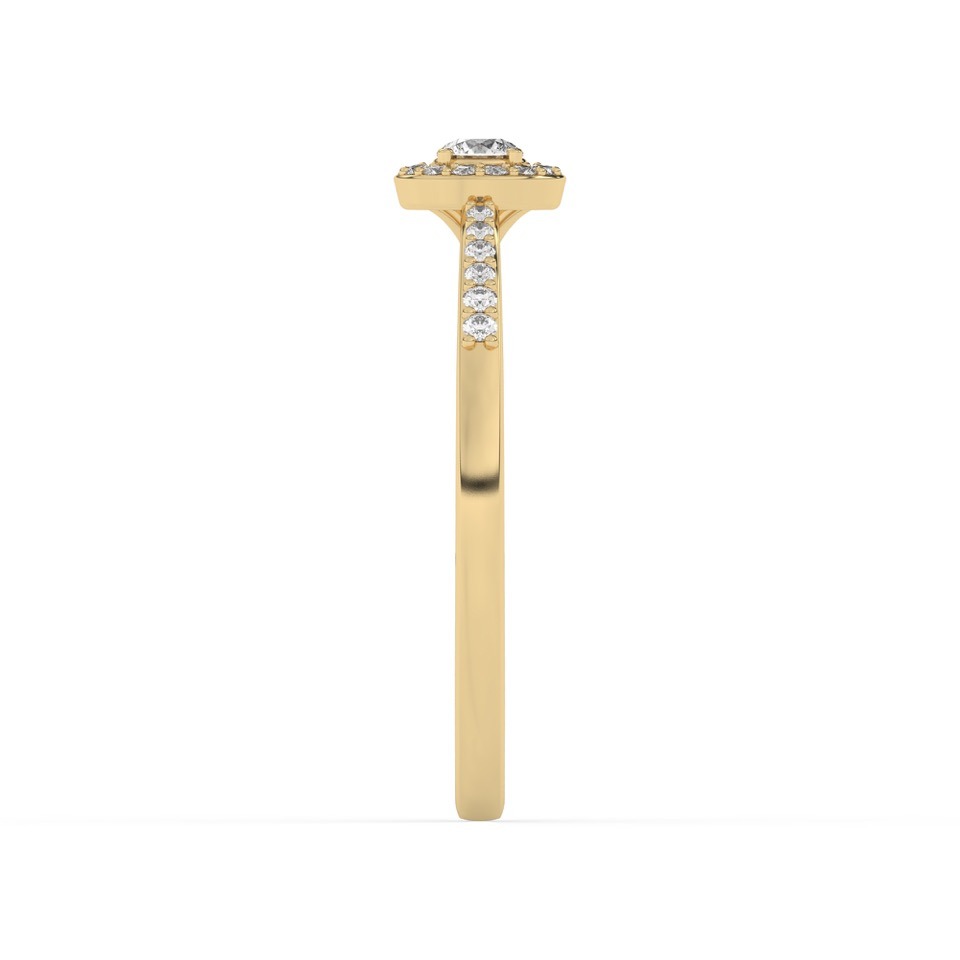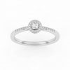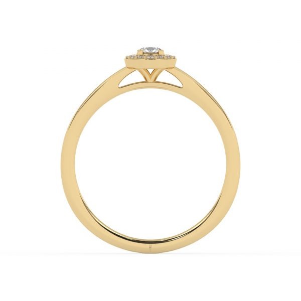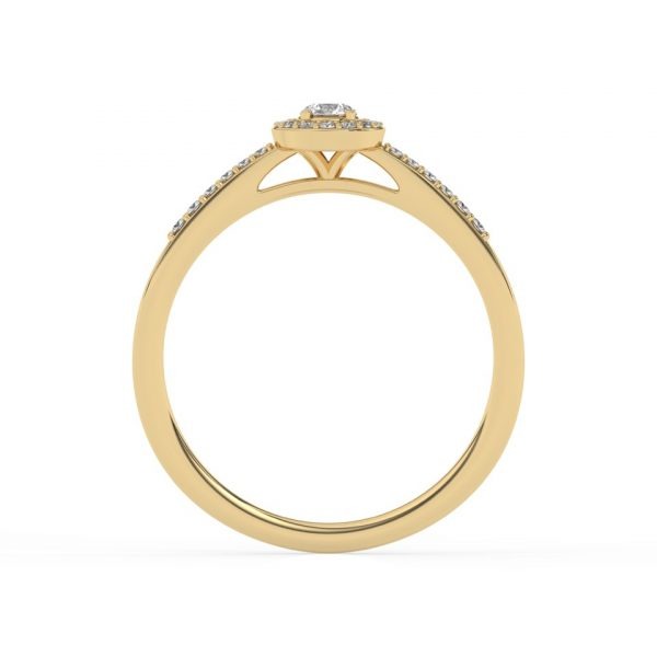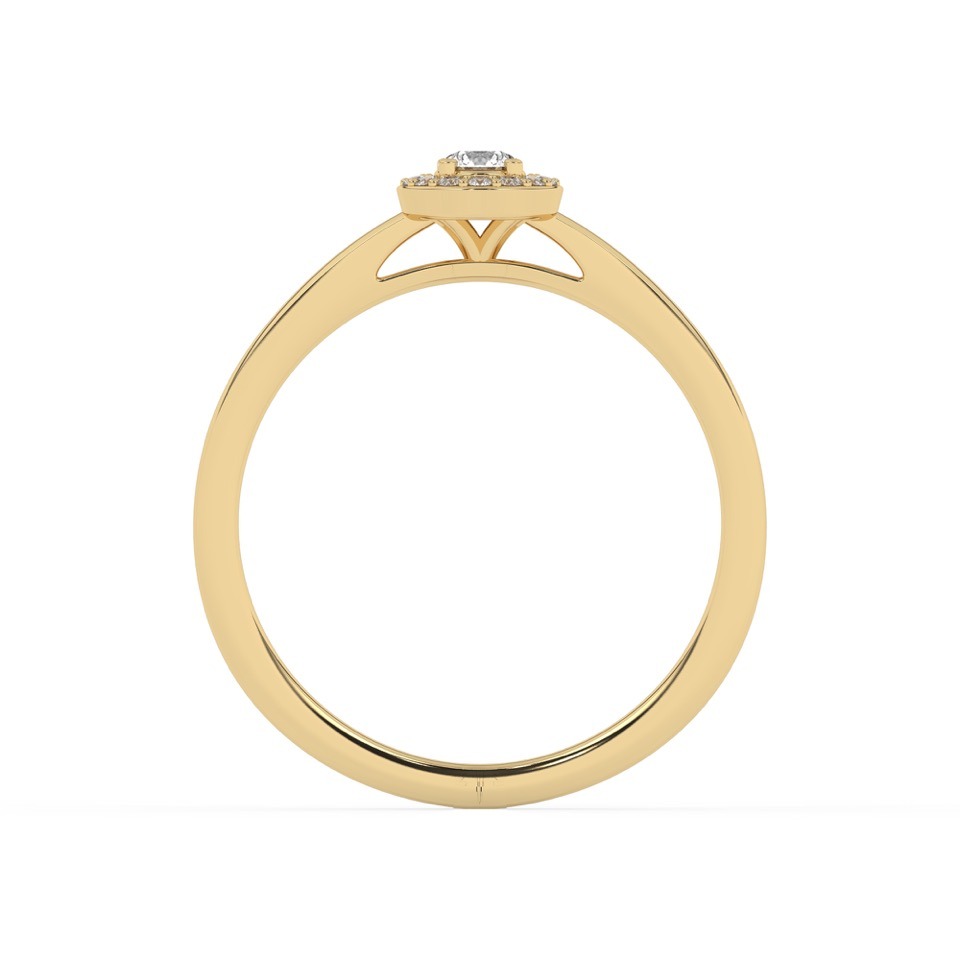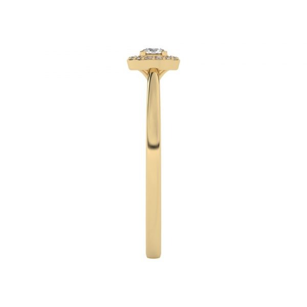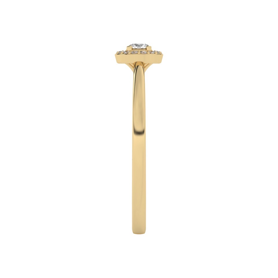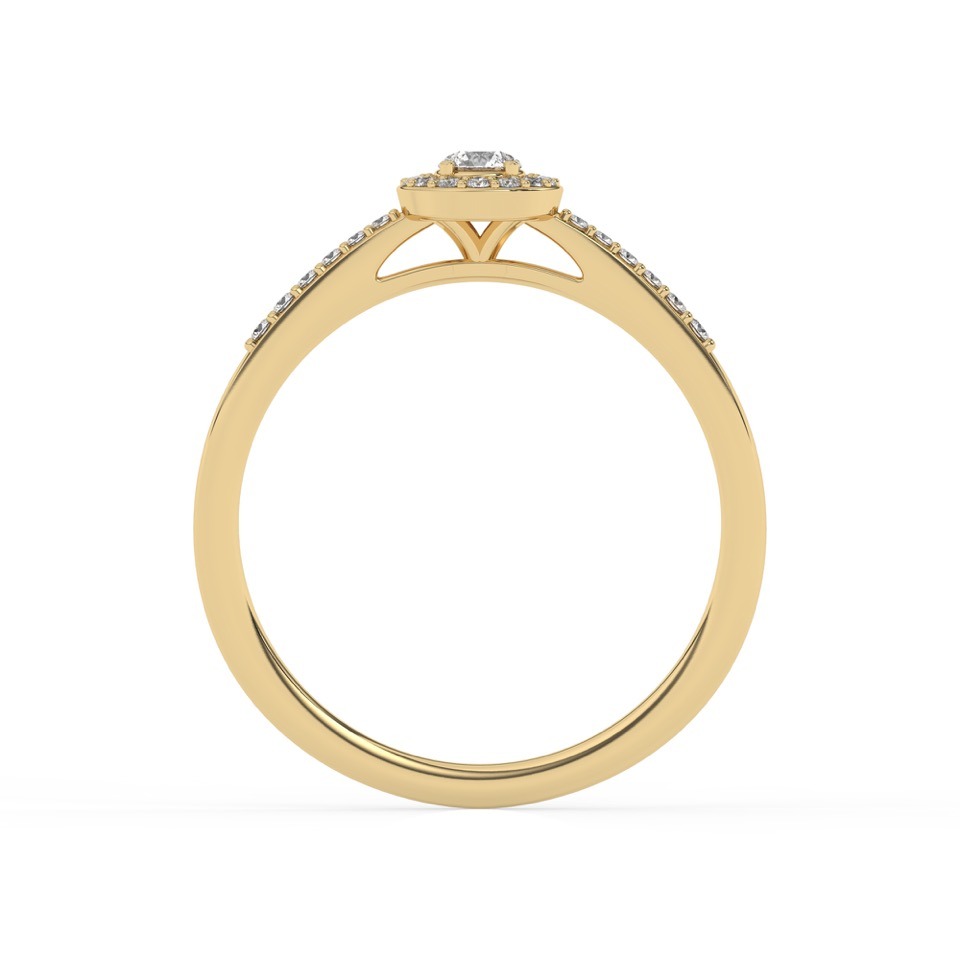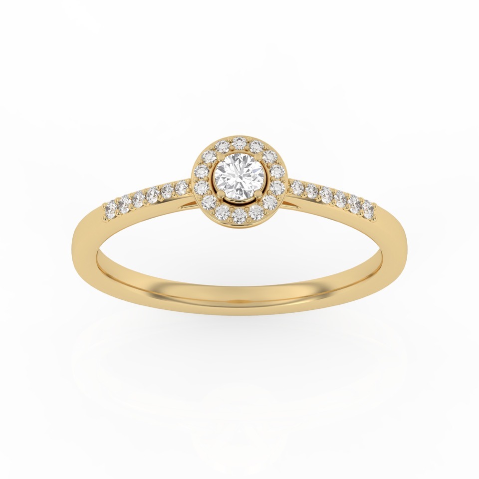 Bague solitaire avec son diamant central entouré d’un halo fin et délicat.
