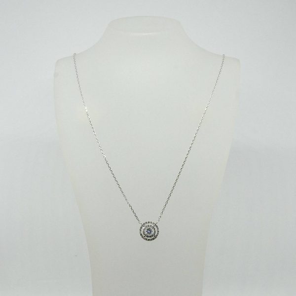 Collier solitaire avec un centre diamant H/SI et un double entourage diamant sur une chaîne forçat en or blanc 750/1000.
