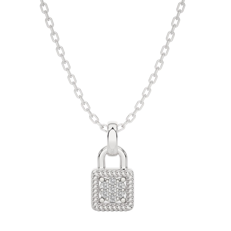 Pendentif cadenas en diamant, accroché à sa chaîne fine et lumineuse.