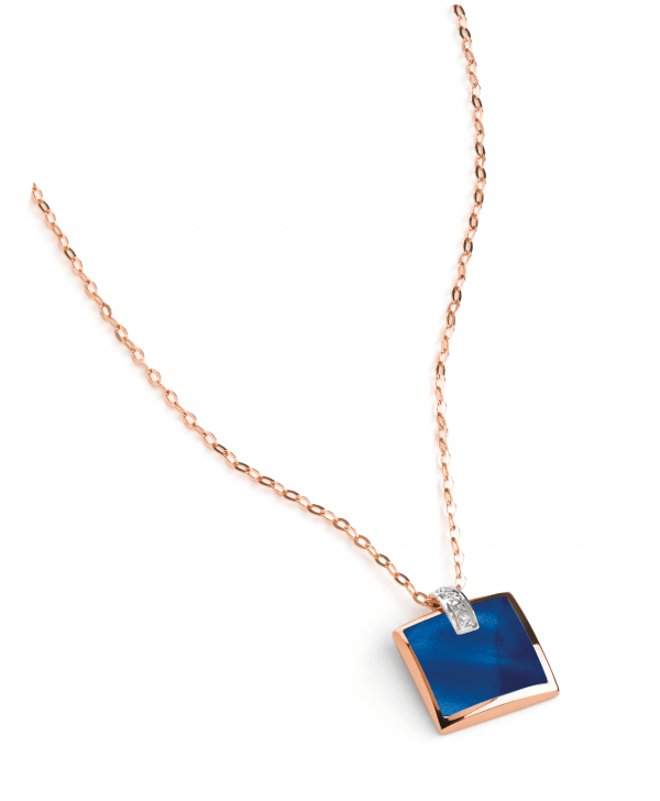 Un pendentif carré à la ligne douce, sublimé par une résine nacrée aux reflets délicats, disponible dans la couleur de votre choix.