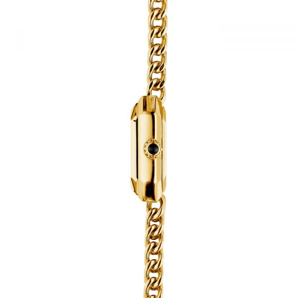 Le bracelet tissé d’une maille fine en PVD or jaune apporte une touche d’éclat à cette montre.
