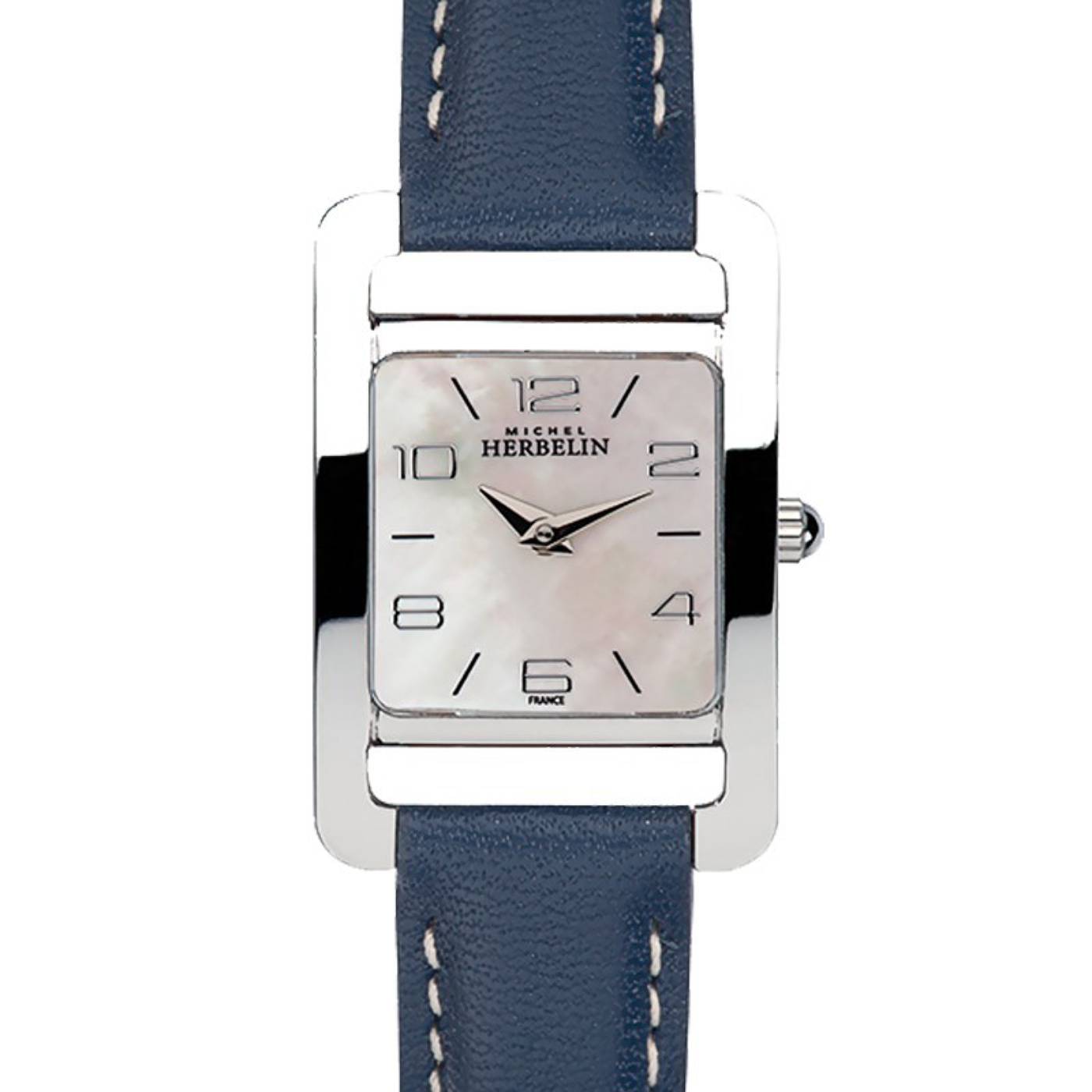Décalée par sa couronne à midi, cette montre Michel HERBELIN assume sa différence. Un boîtier rectangulaire ajouré la démarque avec style. Habillée d’un bracelet en cuir de couleur bleue rehaussé d’une surpiqûre blanche, la collection 5ème Avenue épouse avec harmonie les poignets féminins.