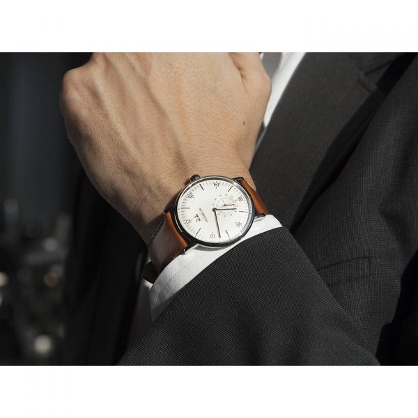 Le guichet date à douze heures et le compteur, petite seconde, chiffré viennent renforcer les détails et dynamiser son allure contemporaine.