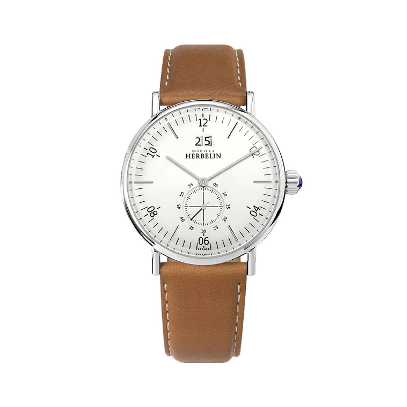 Cette montre Michel HERBELIN est équipée d’un boîtier moderne, de 40 mm de diamètre à la carrure toute en rondeur, qui apporte une touche de modernité à son allure vintage. L’Inspiration dévoile un cadran blanc ponctué d’index bâtons affinés et de chiffres arabes pairs noirs offrant ainsi précision et lisibilité de l’heure.