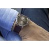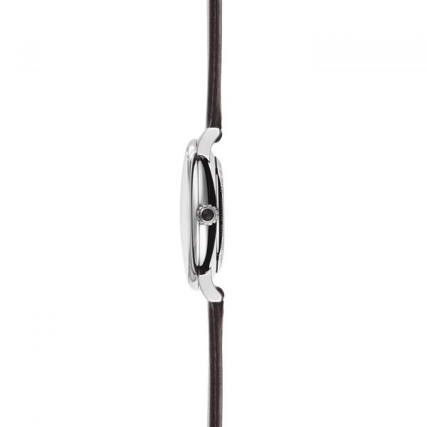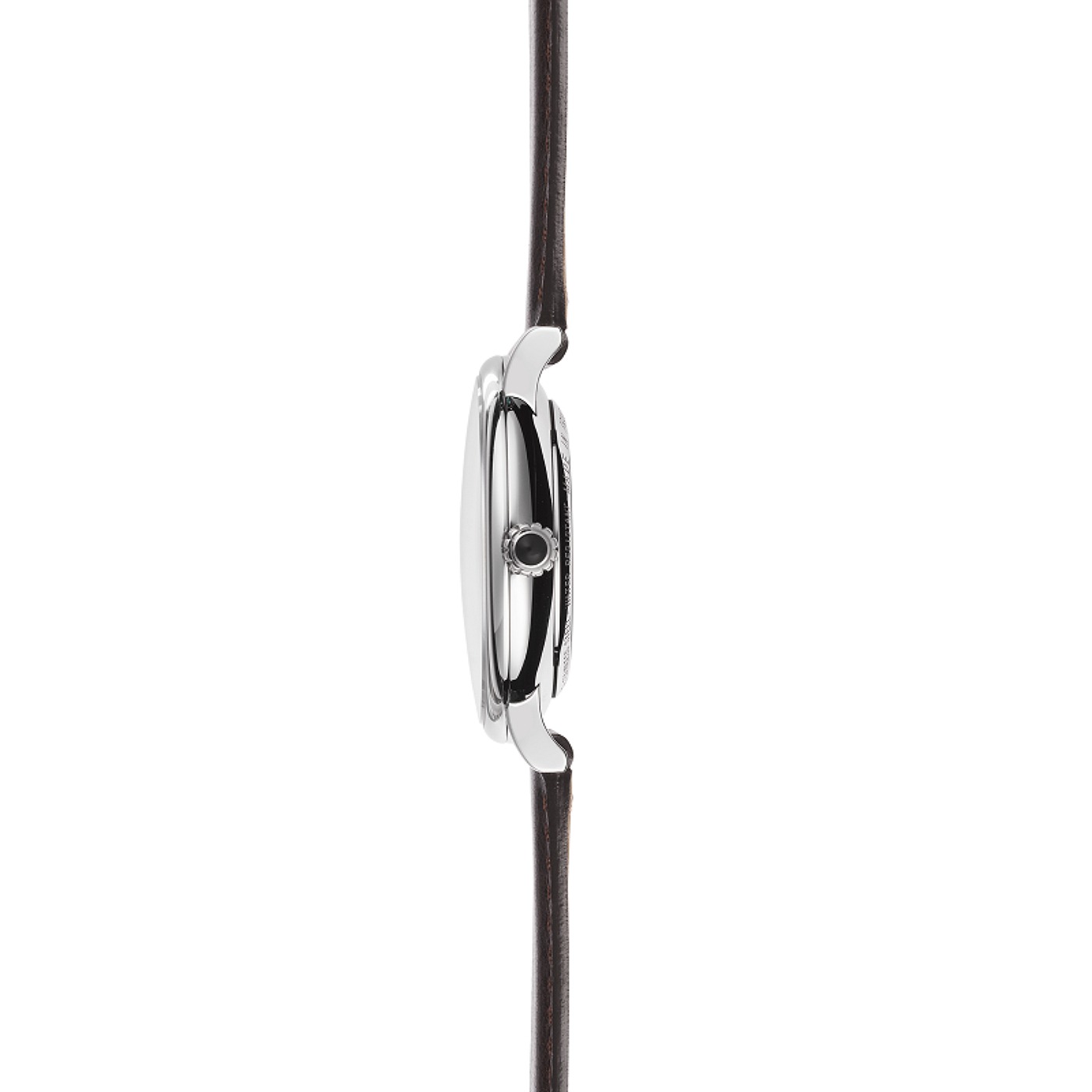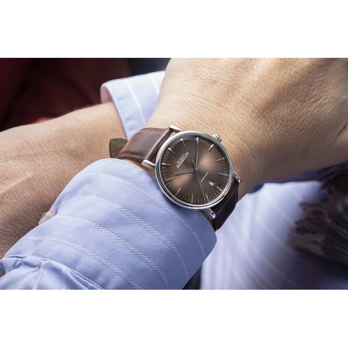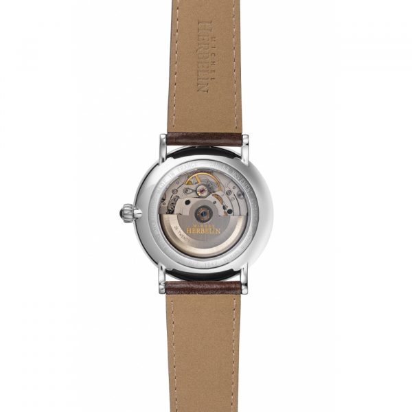 Cette montre Michel HERBELIN est équipée d’un mouvement mécanique à remontage automatique, qui laisse admirer ses rouages par le fond transparent du boîtier. Elle est dotée d’un boîtier à la carrure toute en rondeur, de 40 mm de diamètre, qui lui donne une allure vintage. Celui-ci dévoile un cadran cappuccino, offrant de multiples nuances sous l’effet de la lumière par son décor brossé soleillé. Complété à 6 heures d’un guichet de date discret, l’ensemble cadence le passage du temps avec sobriété. Finalisée d’une couronne boule cannelée sertie d’un cabochon bleu et habillée d’un bracelet en cuir patiné brillant marron, cette pièce est un véritable bijou horloger dessinée et assemblée en France dans les ateliers de la marque Michel HERBELIN.