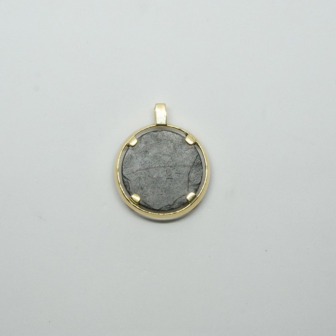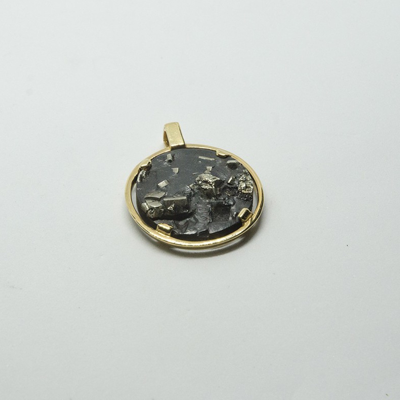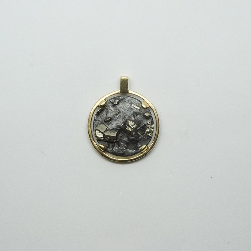 Médaille en or jaune 750/1000 agrippant une pyrite brute sertie 4 griffes.