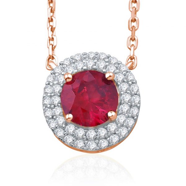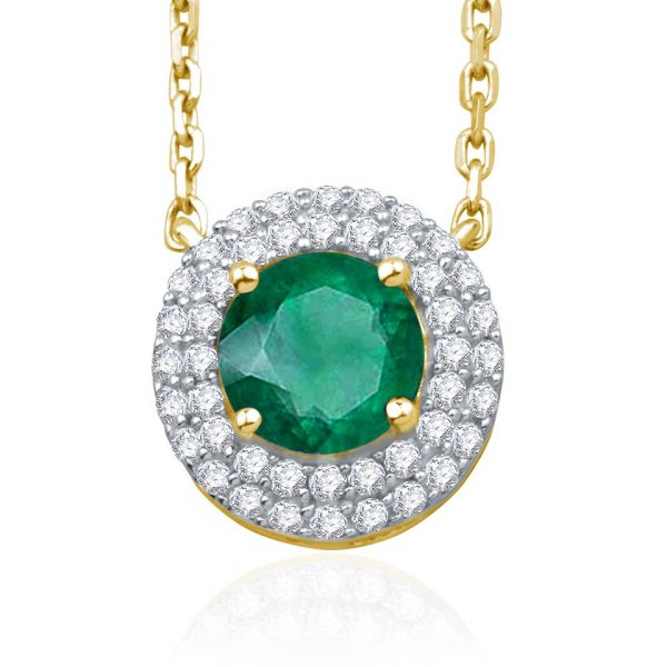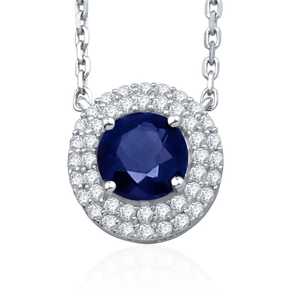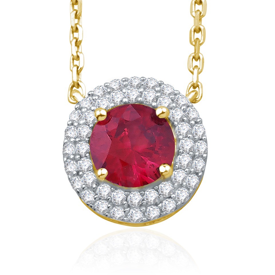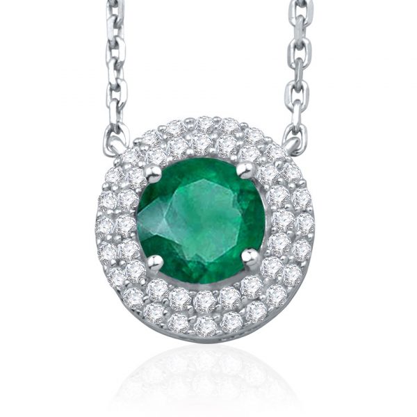 Pendentif émeraude, rubis ou saphir, sublimé par un double entourage de diamants finement sertis à griffes sur or blanc.